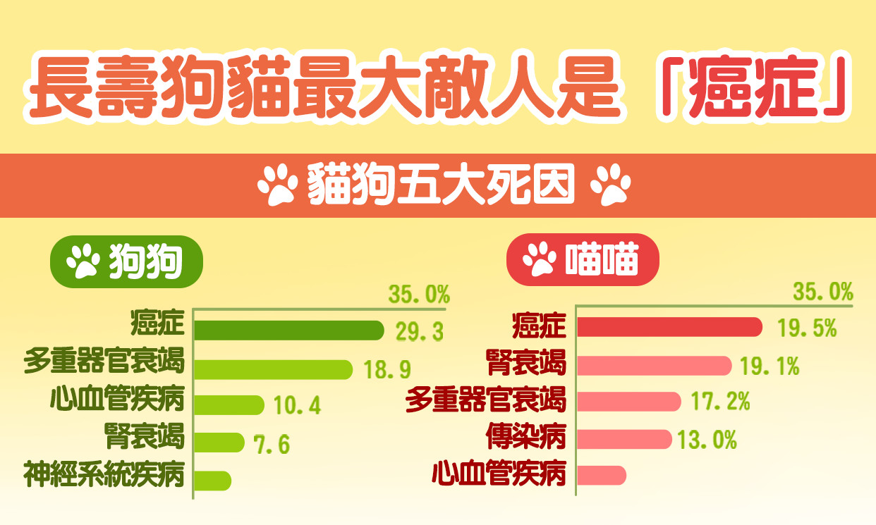 狗貓的腫瘤或癌症、近幾年已成飼主心中最大的隱憂,常聽到有狗狗得到肝腫瘤、纖維組織細胞瘤、乳腺瘤、黑色素瘤、脾臟腫瘤、淋巴癌,甚至還有汗腺瘤。事實上,根據台北市動保處與台大獸醫院合作研究,2014年狗貓十大死因中,癌症位居首位。