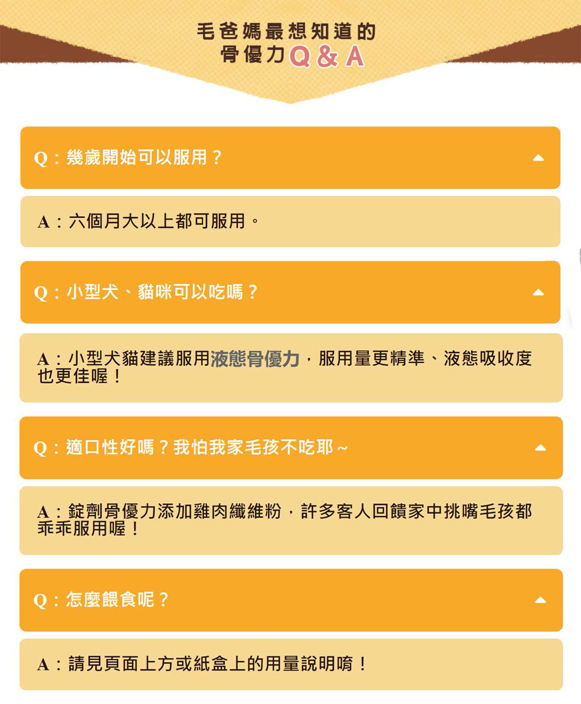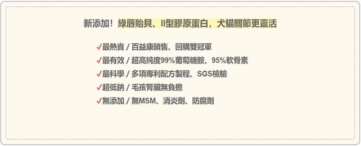 ◆韓國專利水解魚鱗膠原蛋白配方。為針對犬貓骨關節所設計之保養品,採用純度高達99%的鹽酸鹽葡萄糖胺,純度99%的乙醯葡萄糖胺,純度95%的軟骨素、II型膠原蛋白。
