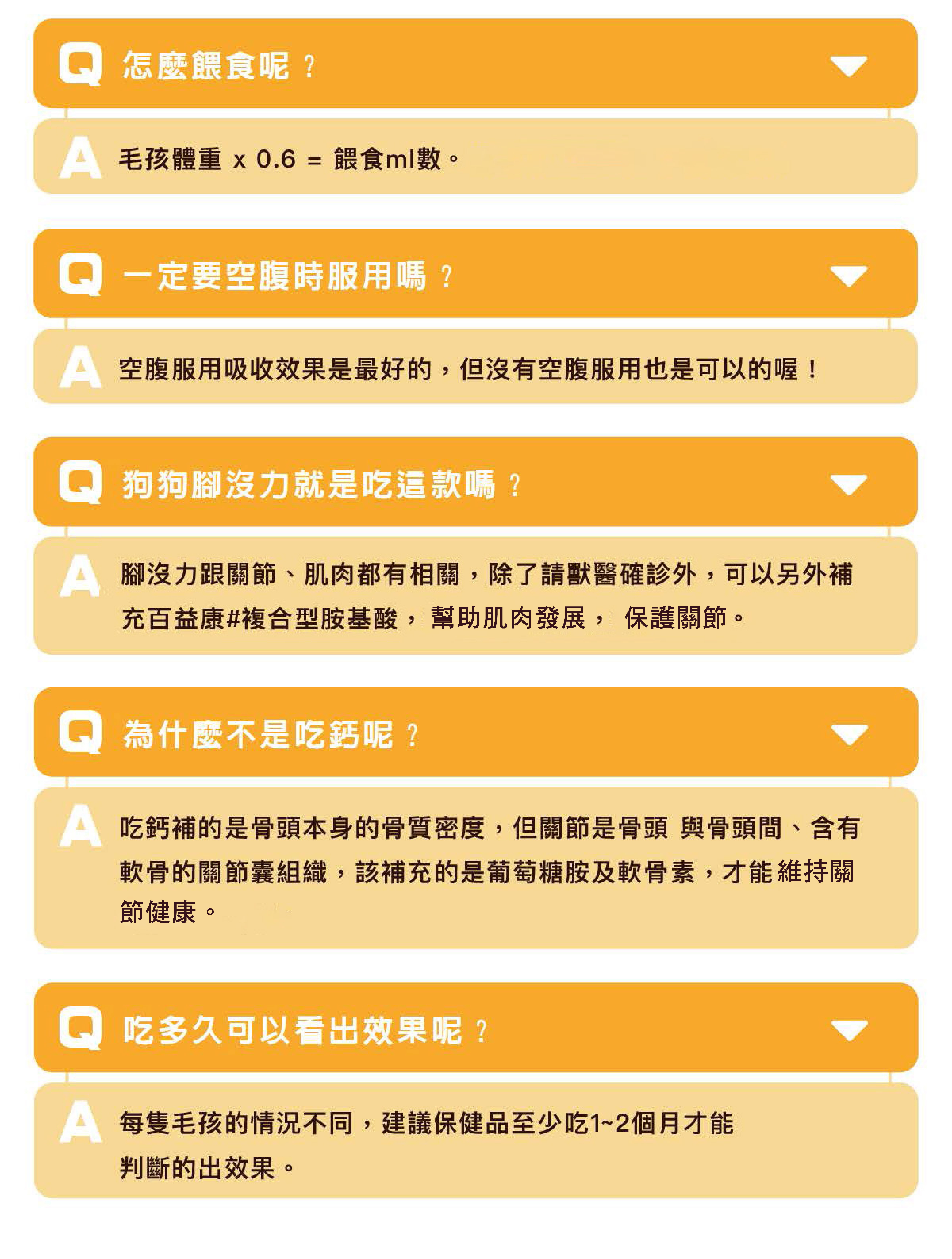 ◆韓國專利水解魚鱗膠原蛋白配方。為針對犬貓骨關節所設計之保養品,採用純度高達99%的鹽酸鹽葡萄糖胺,純度99%的乙醯葡萄糖胺,純度95%的軟骨素、II型膠原蛋白。