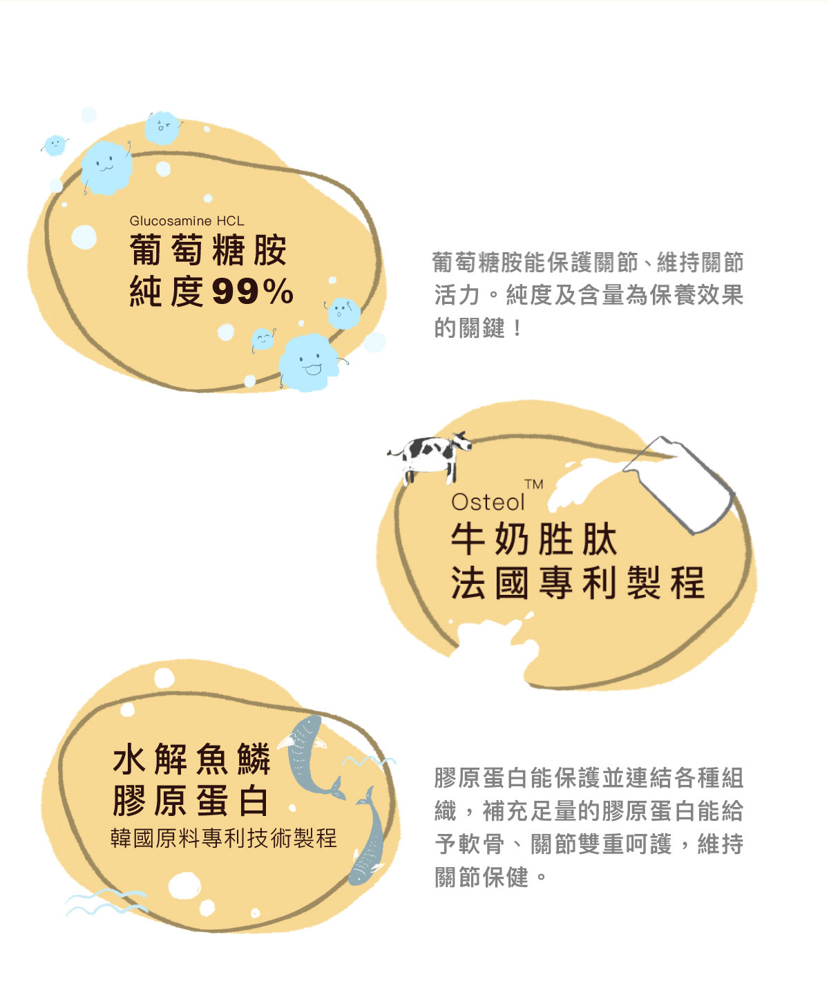 ◆添加世界專利的珍貴營養素Osteol,可提高葡萄糖胺及軟骨素吸收,減少鈉鹽攝取。
