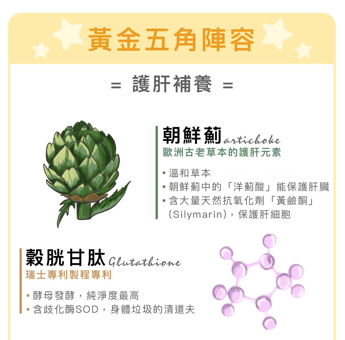 ◆含有朝鮮薊(Artichoke)萃取物,再搭配薑黃素、維生素B群、蜆精、蠔精、花椰菜萃取物等,提供肝臟充足的營養素。