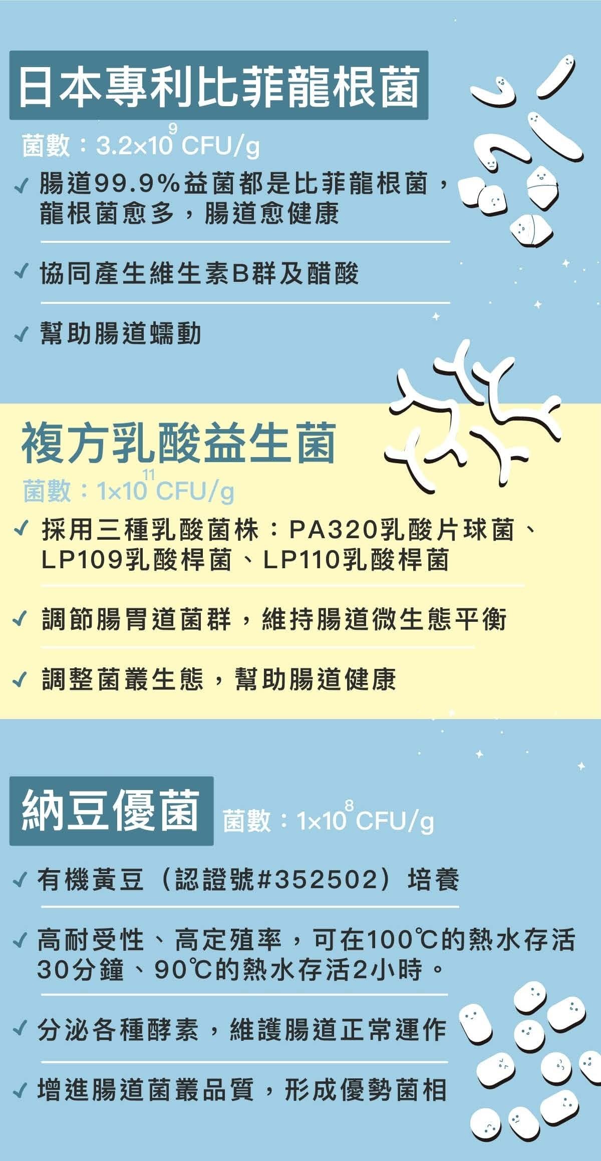 善益菌嚴選四大優質菌種,凝結芽孢桿菌、複方乳酸益生菌、日本專利比菲龍根菌、納豆優菌。